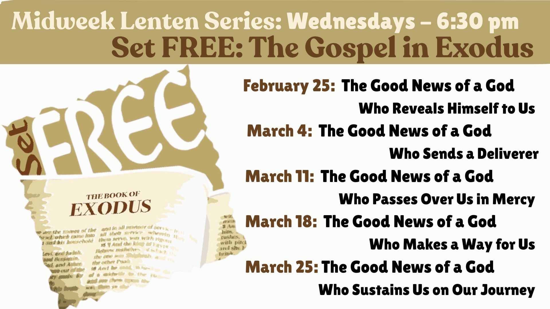 Wednesdays 6:30 pm: The Gospel in Exodus series